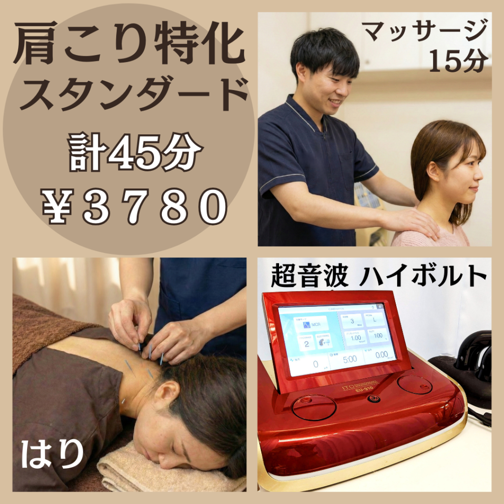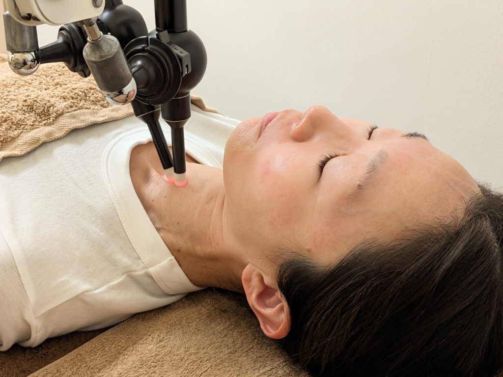 姿勢・肩甲骨の状態を丁寧にチェックしたうえで、電気&超音波による筋肉ほぐし、深部組織への「鍼」を実施。