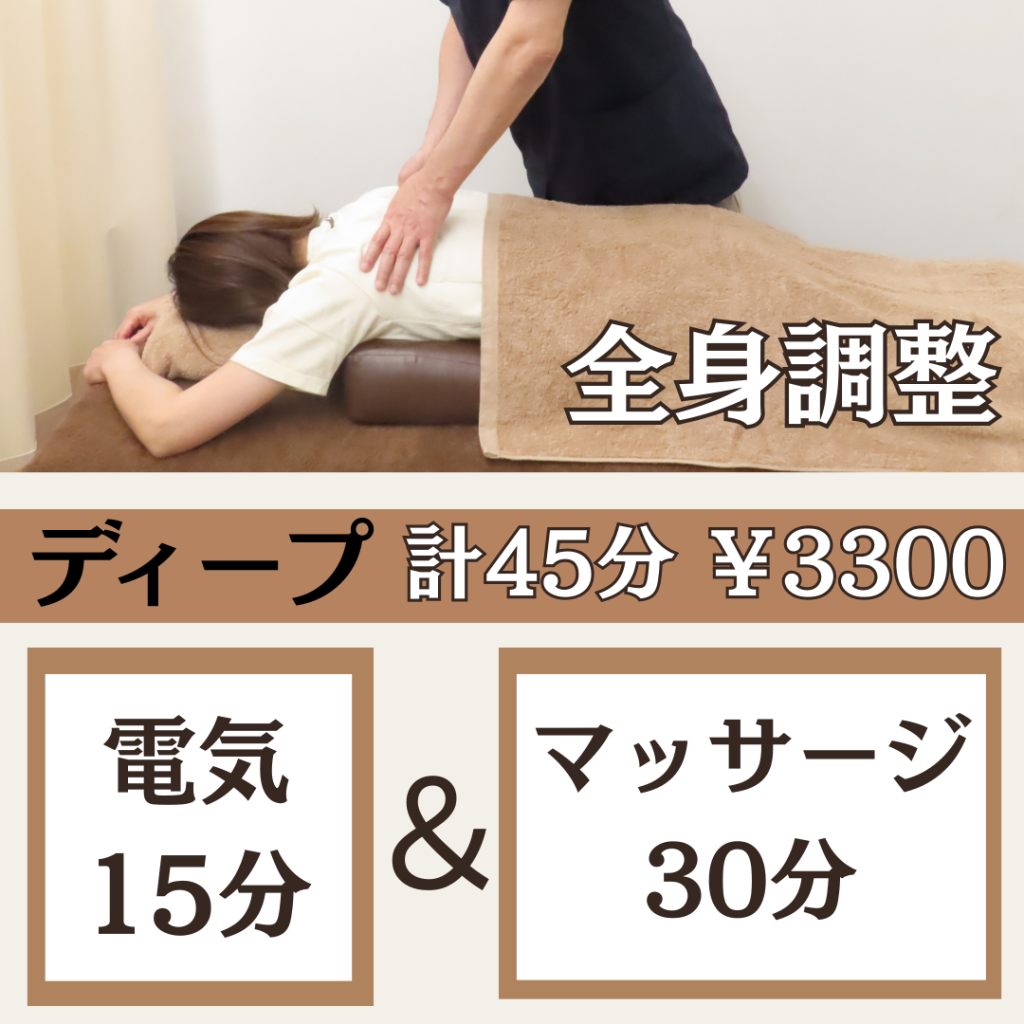 姿勢・肩甲骨・骨盤・下肢長の状態をチェックしたうえで、電気刺激で筋肉ほぐし(15分)と、しっかりマッサージ&ストレッチ【30分】を組み合わせた効果的な施術。