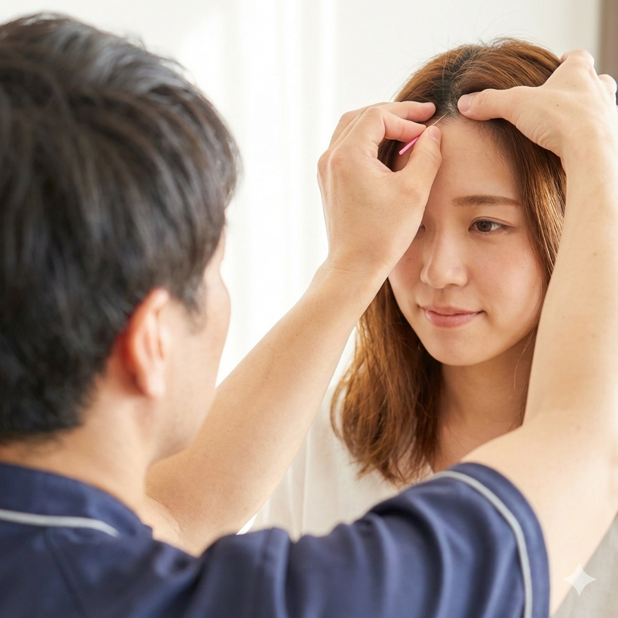 YNSA®の基本治療では、腕や首、腹部の圧痛や硬結を確認し、頭部にあ9つある「A」~「I」までの基本点を症状に応じて組み合わせ、鍼を行います。